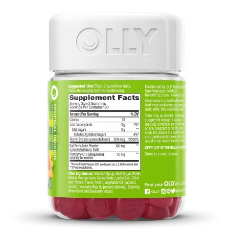 Dietary Supplement OLLY® Daily Energy Vitamin B12 / CoQ10 / Goji Berry 300 mcg – 30 mg – 100 mg Strength Gummy 60 per Bottle Tropical Passion Flavor