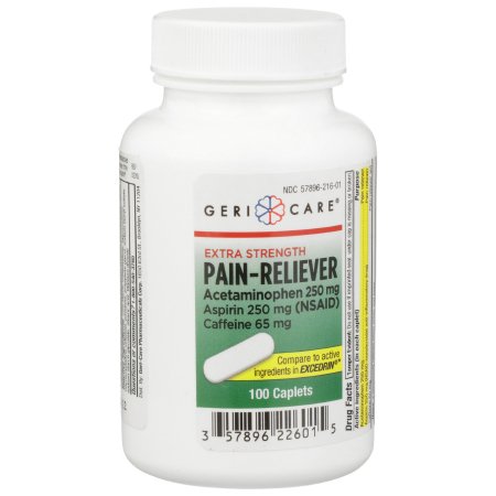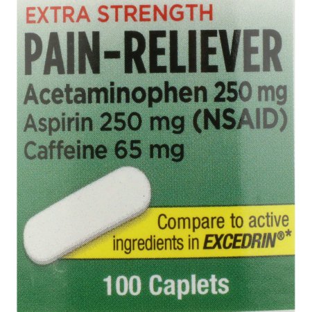 Pain Relief McKesson Brand 250 mg – 250 mg – 65 mg Strength Acetaminophen / Aspirin / Caffeine Caplet 100 per Bottle
