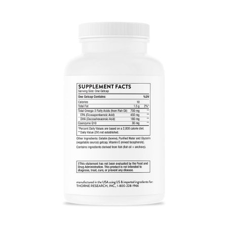 Dietary Supplement THORNE® Omega-3 with CoQ10 EPA / DHA / Coenzyme Q10 450 mg – 180 mg – 30 mg Strength Gelcap 90 per Bottle