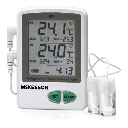 Datalogging Refrigerator / Freezer Thermometer with Alarm McKesson Fahrenheit / Celsius -58° to +158°F (-50° to +70°C) 2 Glycol Bottle Probes / Internal Sensor Flip-out Stand Battery Operated